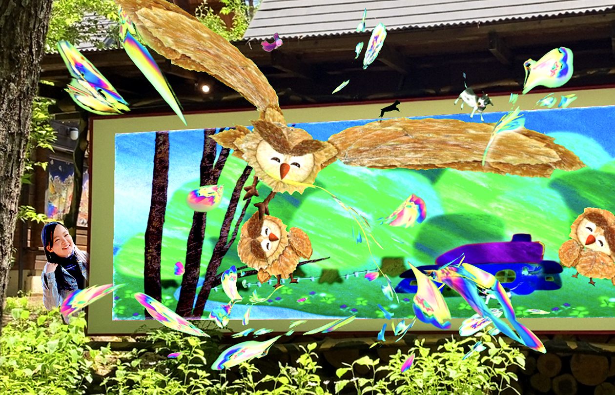 In a museum located in the forests of Azumino, large-scale murals measuring around 3 to 5 meters are displayed outdoors. Inside the museum, visitors can enjoy artworks and videos, and complimentary tea is also available.